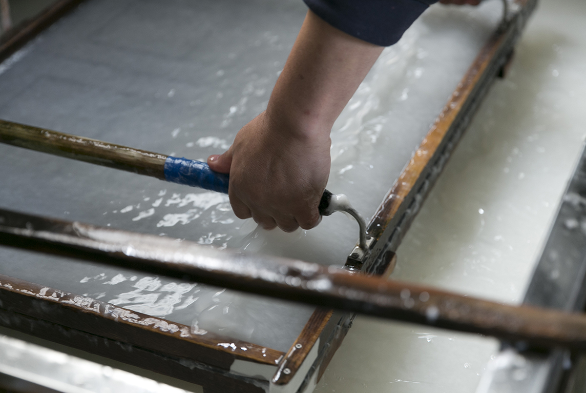 1872年(明治元年)創業、越前和紙の手漉き工房。創業時は「奉書」など無地の和紙を製造していましたが、1950年(昭和25年)頃より、“引っ掛け”、“漉き合わせ”等の技法で千代紙・包装紙など「美術小間紙」の製造が主に。現在は、独自の技法で凹凸をつけた「浮き紙」という和紙を用いた茶缶やカードケース、缶バッチなど現代的な商品も制作し、和紙の可能性を探求し続けています。